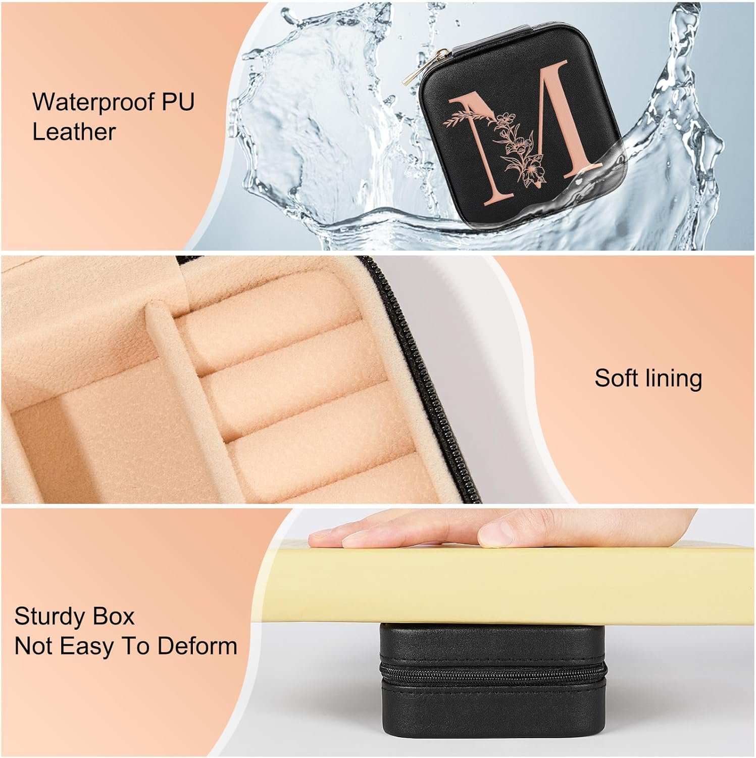 Waterproof Surface and Soft Interior : Crafted from waterproof PU leather, the exterior protects your jewelry from water, the soft inner fabric prevents scratches; The sturdy construction and durable zipper making it a reliable jewelry travel case for women