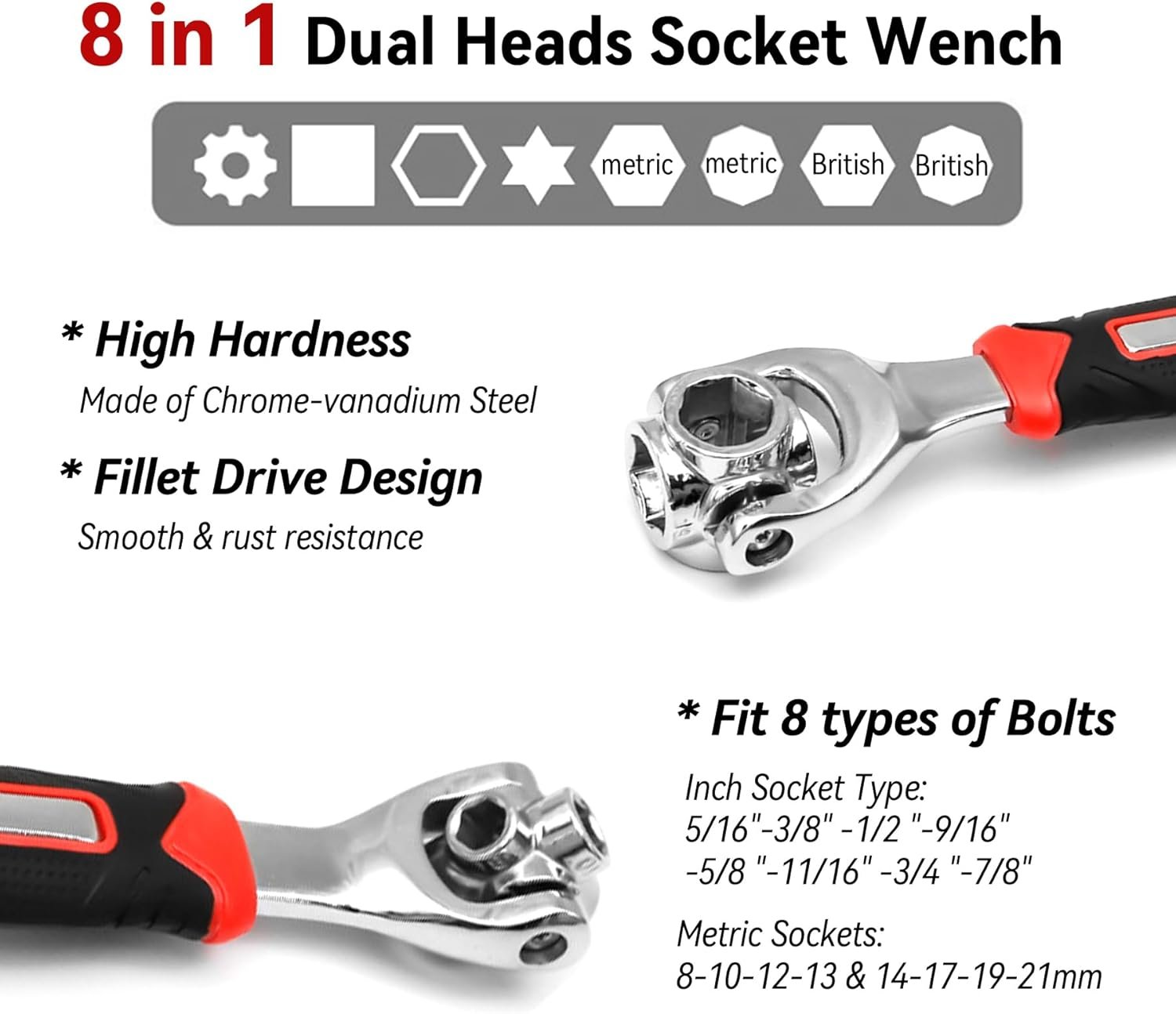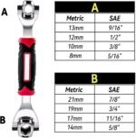 【Double-ended Universal Socket Wrenches】Work with 6 Point, Square Bolts, Damaged Bolts and Any Size Standard or Metric Bolts,12mm (3/8″), 13mm (1/2”), 14mm(9/16”), 15mm (19/32″), 16mm (5/8″), 17mm (11/16″), 18mm (23/32″), 19mm (3/4″), It Shows On The Wrench with Numeric Etchings to Show The Corresponding Sizes.