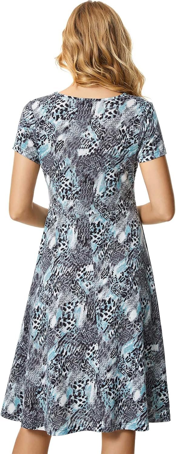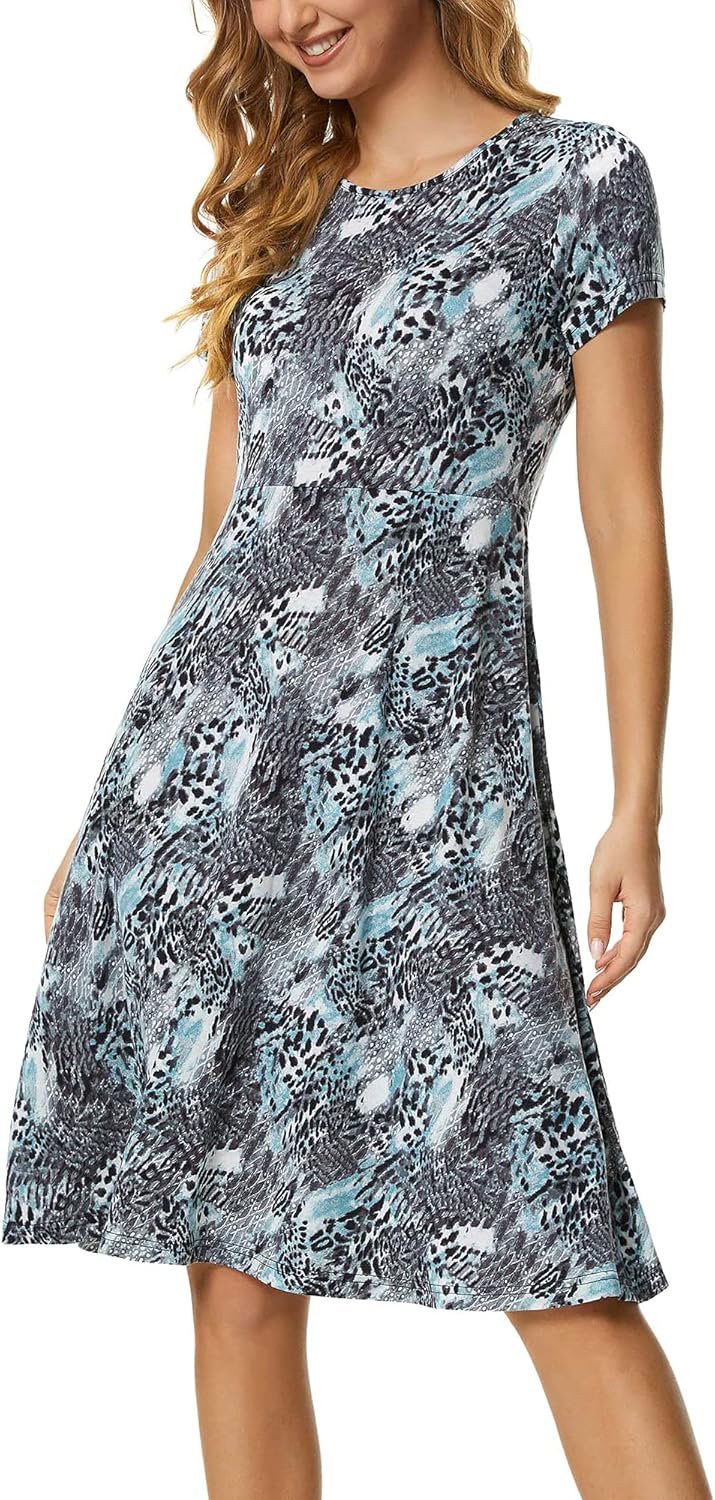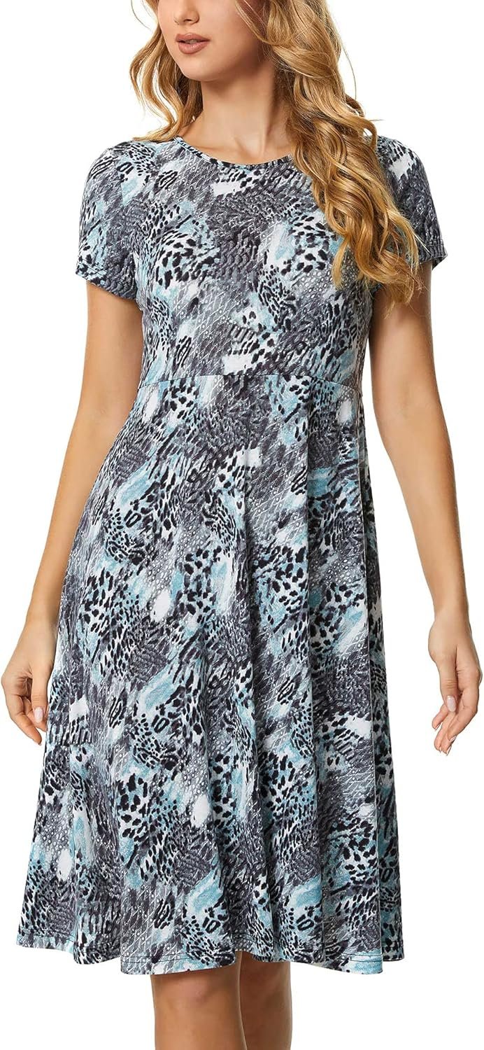 Features short sleeve,round neck,flare skirt bottom and various colors