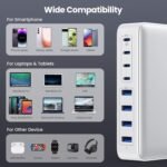 【4 USB-C & 4 USB-A Ports Independently Charging 8 Devices at Once】We USB C Charger Block Unlike most chargers with false advertising and outputs that slow down when multiple ports are used, We USB C charging stations feature 8 independent output ports, ensuring all devices can charge simultaneously at full speed without power sharing and disconnection. this 8-in-1 charging station will reduce your accessories burden and help you create an organized and clean desktop.