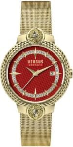 Versus Versace Mouffetard Collection Luxury Womens Watch Timepiece with a Gold Bracelet Featuring a Gold Case and Red Dial