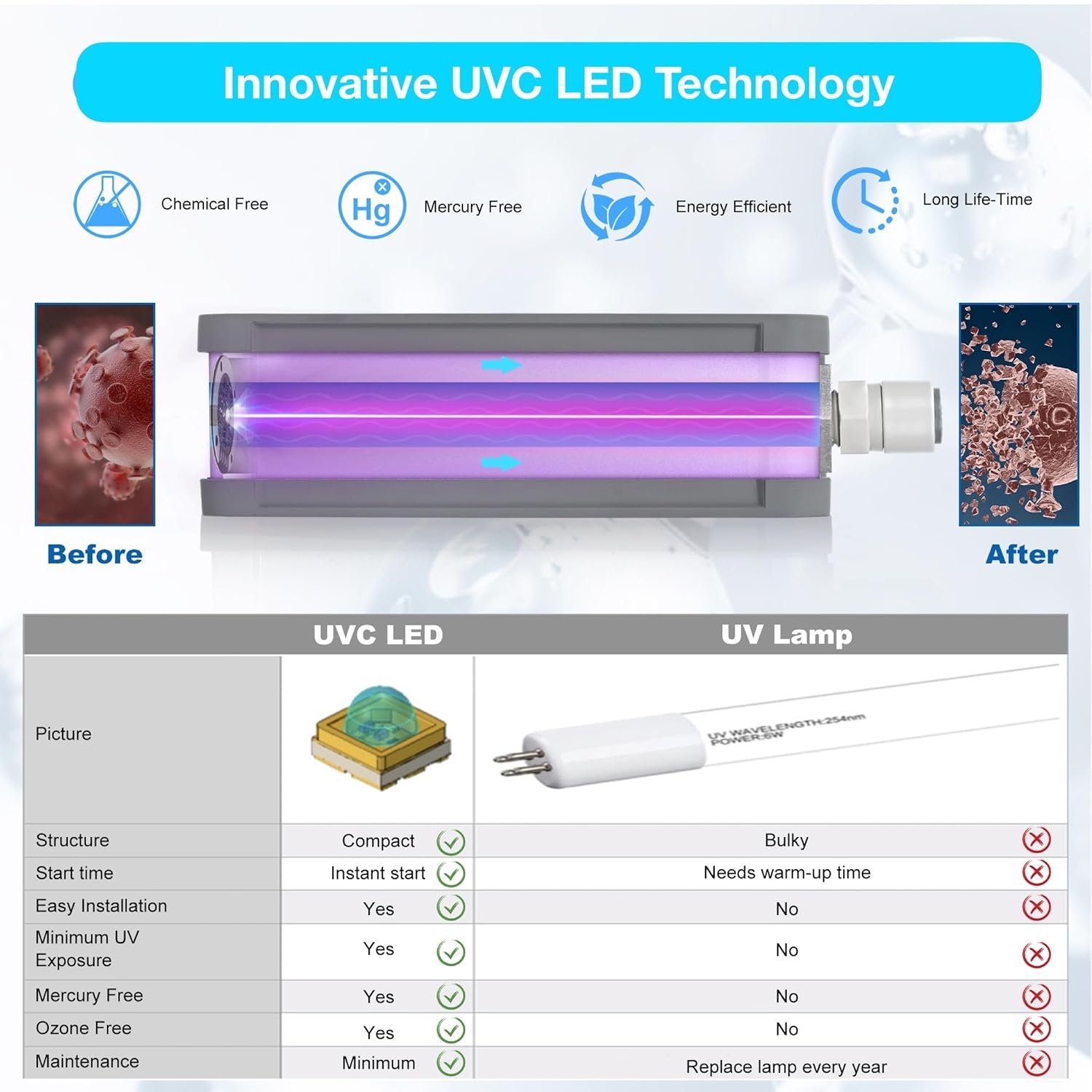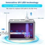 EFFICIENT – With the innovative UV-C LED tenchnology, this water filter purifier doesn’t transfer heat to the water. It doesn’t need warm-up. Instant start, instant operation, instant full efficacy delivery, constant UV output. This makes it different from conventional Mercury UV lamp.