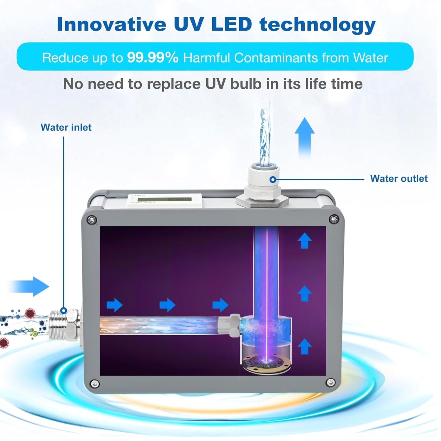 Mercury free.Ozone free.Minimum UV light exposure.No need professional installation.No need replacement of UV lamps every year. Minimum maintenance requirements.Doesn’t need warm-up, instant full UV brightness. Doesn’t transfer heat to the water.Long life-span, low energy consumption.Compact in size