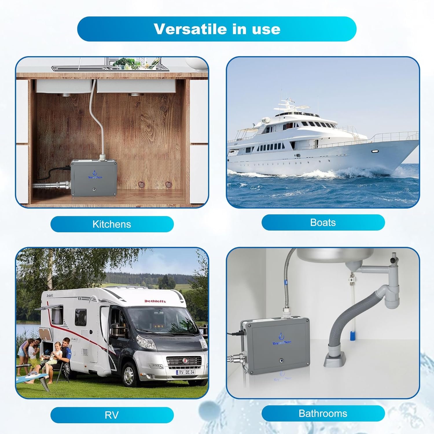 The machine is compact and durable. It can be used alone for water treatment in RV, Camper, Boat, Motorhome, Off-Grid livings, or along with RO (Reverse Osmosis) and well water filtration system, adds an extra protection before drinking water, refrigerator water, or ice maker.