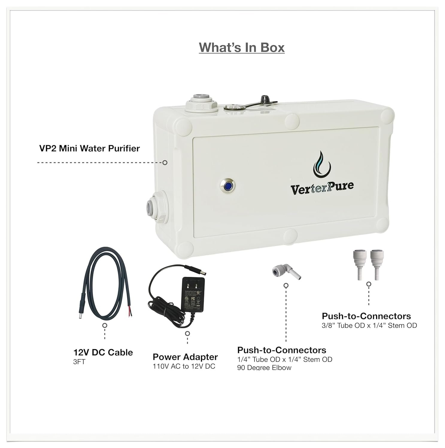 VP2 Mini UV-C LED Ultraviolet Water Filter Purifier, Reduce up to 99.99% of Contaminants at Flow Rate 0.52GPM, Smart On/Off Switch, 12V DC for RV Boats Off-Grid Livings, Mercury Free