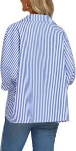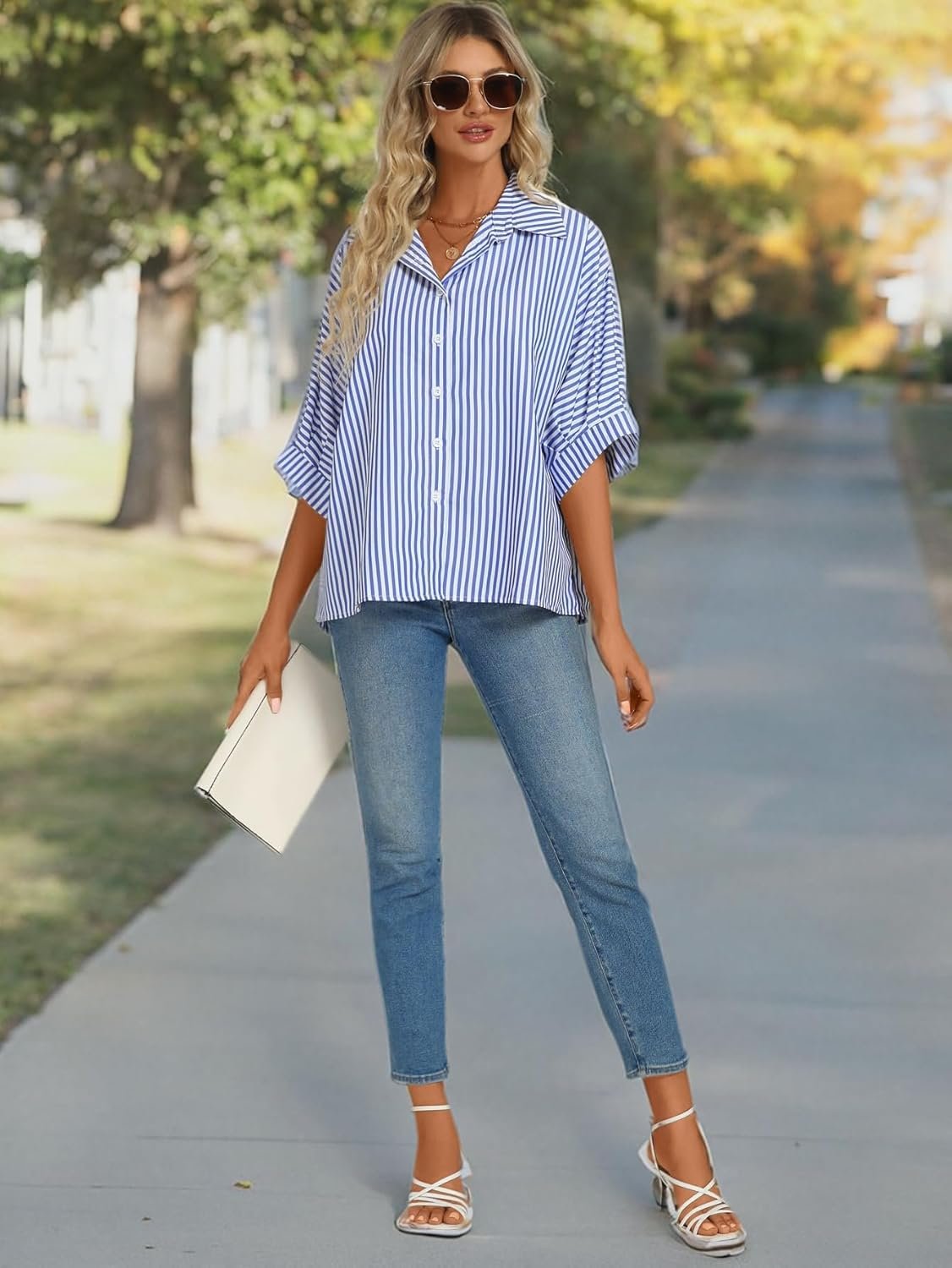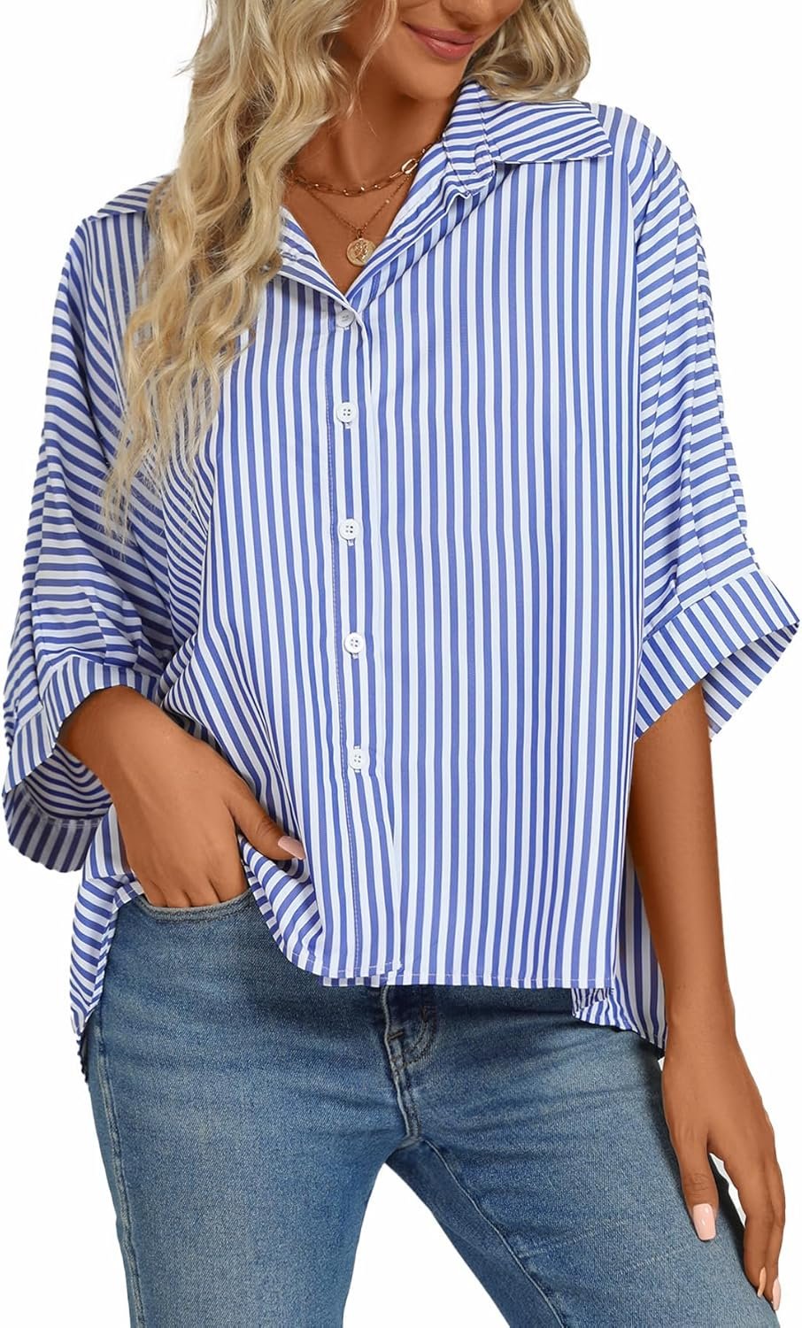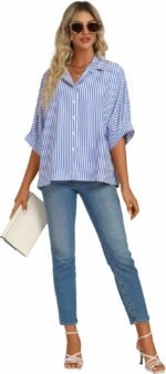 Vrtige Women’s Casual Stripe Button Down Collar V Neck Half Sleeve Loose Blouse Shirt Top
