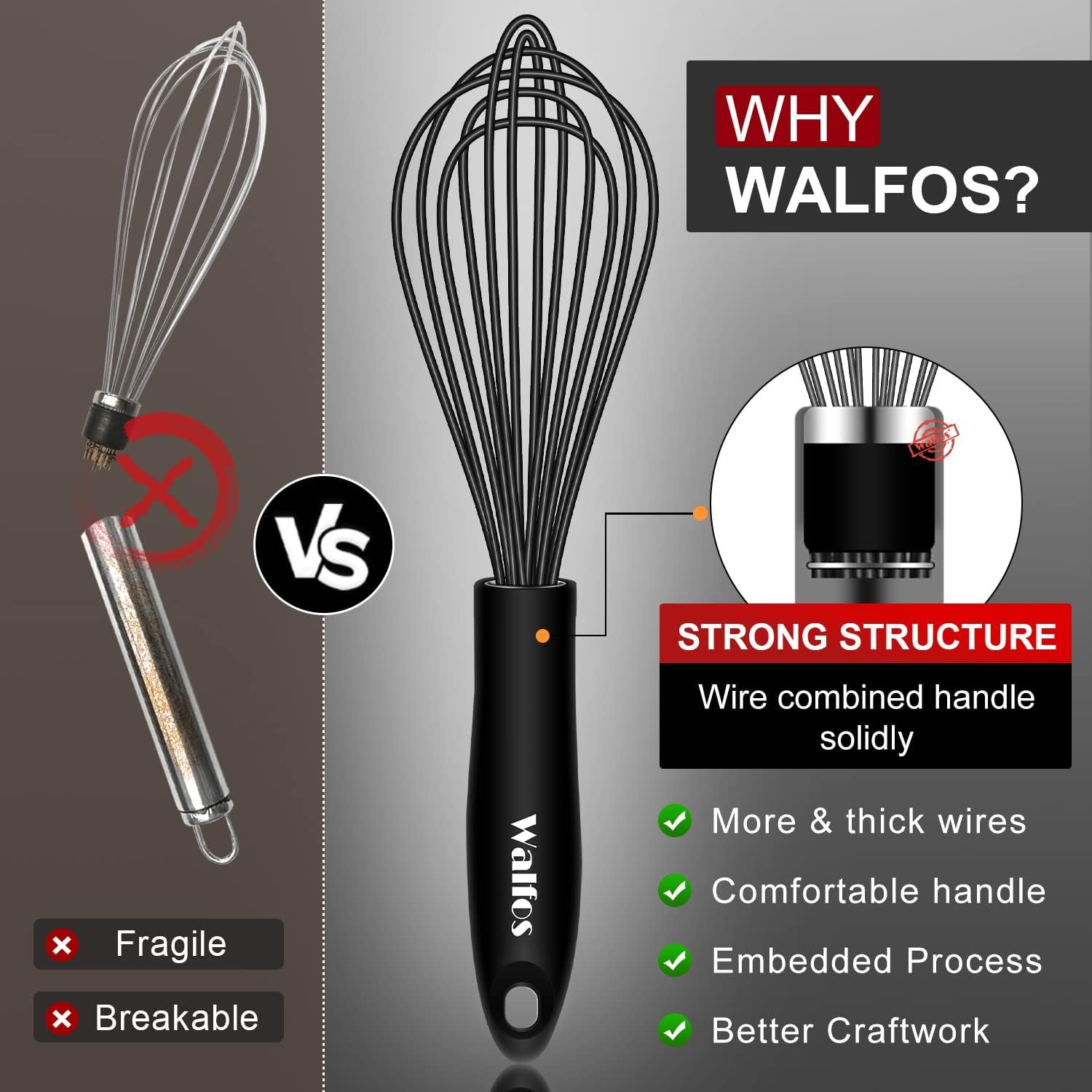 Thickened silicone protective cover, stop scratching your cookware : Walfos whisk is made of 1.65 mm reliable stainless steel with wires non scratch coated coated in 0.3mm soft silicone, non-scratch whisks will not damage or scratch any of your pots, pans, bowls, or other dishes while you cook your favorite meals! , not rust, discolor, deform or melt. The ultimate accessory for nonstick coated baking