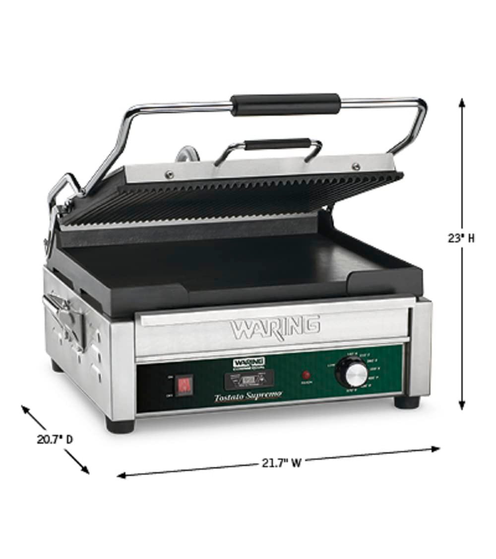 Waring Commercial WDG250T Tostato Supremo Ribbed Top Plate and Flat Bottom Plate Large Surface Panini Grill, With 20 Minute Timer, 120 V, 1800W, 5-15 Phase Plug