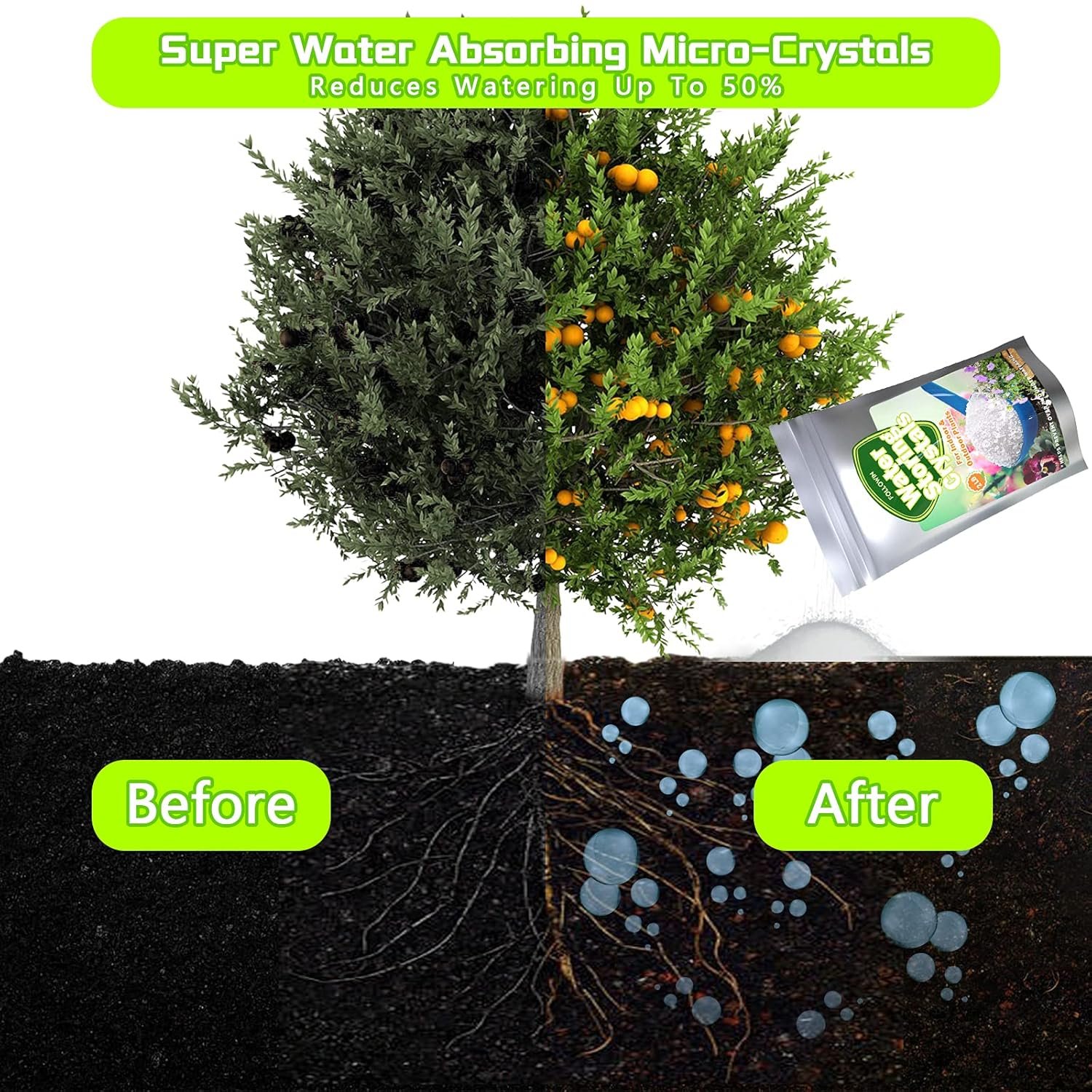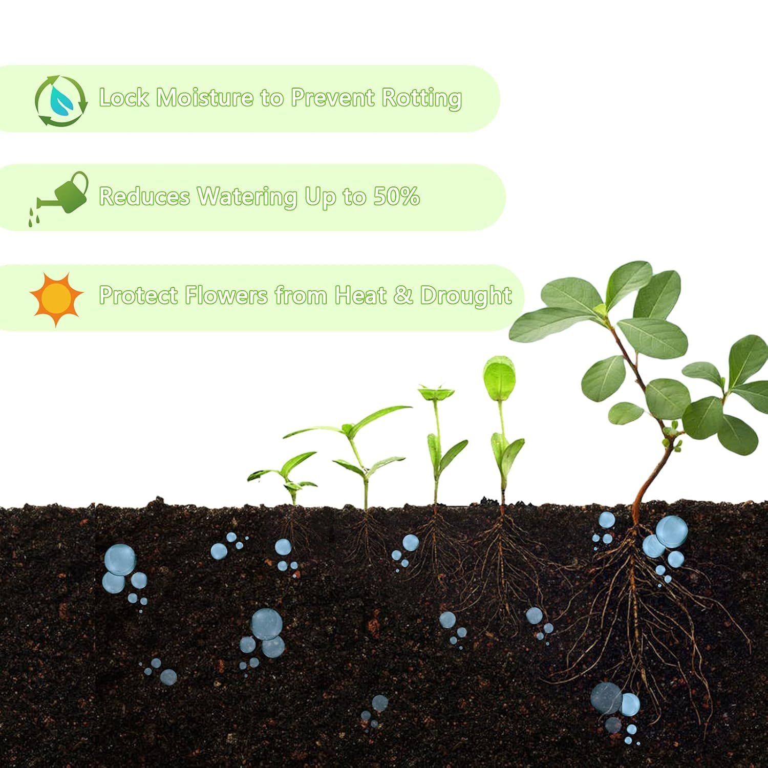 LONG-LASTING KEEP MOISTURE: Our this water absorbing granules can reduce plant waterings by 50% for indoor pots and outdoor gardens, it can last up to 6 -12 months in the soil