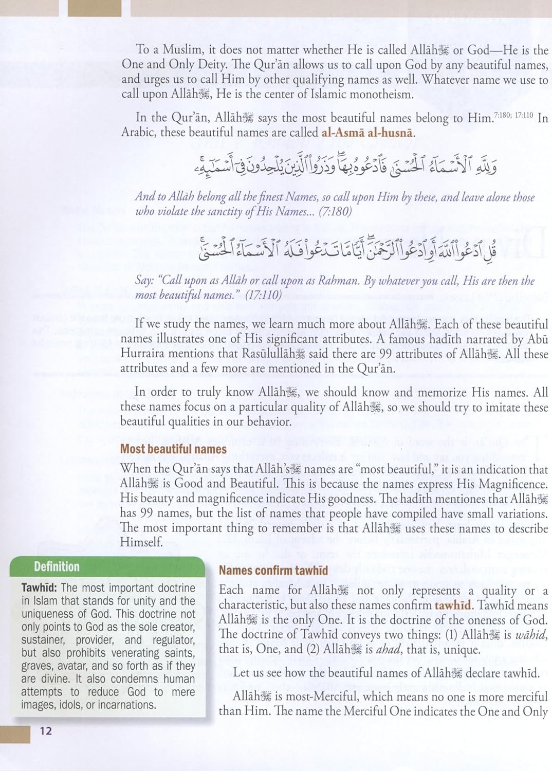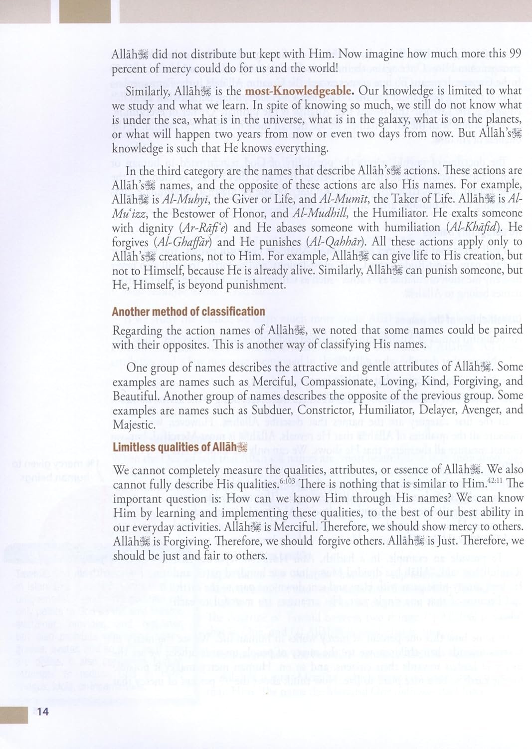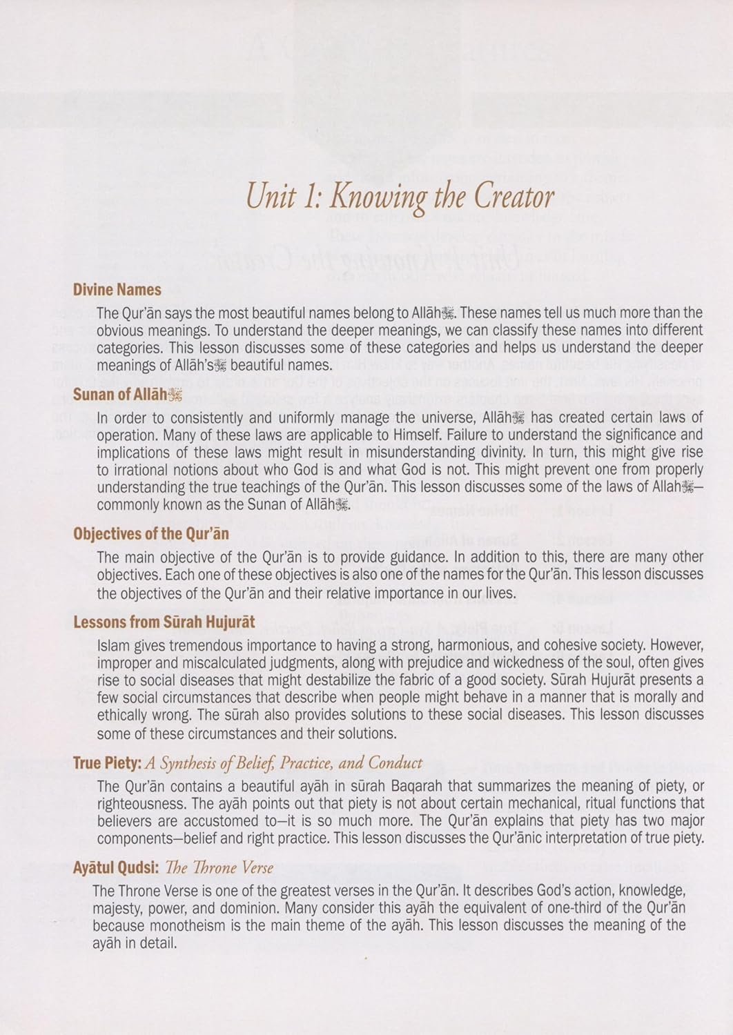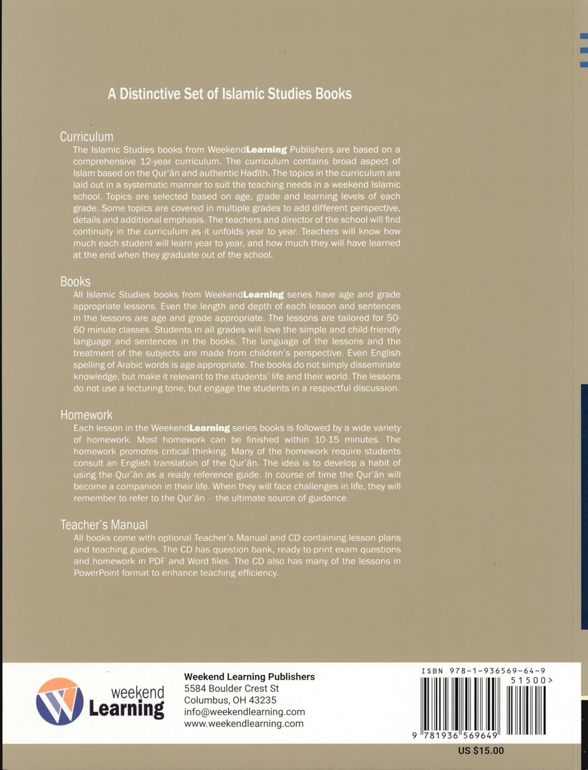 Each level in this curriculum begins with topics on Allah, the Qur an, the Prophet (s), ahadith, or sunnah. The early levels emphasize the five pillars, while later levels contain more detailed studies. In each level, several lessons are devoted to Islamic values to help children develop a sound understanding of Islamic manners, values, and morals. The lessons are designed so that teachers will have a clear path of instruction and can be covered within a 50-60 minute period. Emphasis on each lesson ensures valuable class time is not wasted. Weekend Learning Series features a variety of activities, including word matching and scrambles, fill-in-the-blanks, and more. Teachers will appreciate lesson objectives at the beginning of each chapter, built-in homework sections, and vocabulary words at the end of each chapter. Topics for level 8 include madhhabs, trials in life, friendships with non-Muslims, dating, duties towards parents, Islam for middle school students, some of the battles of the Prophet (s), the early history of Shi ites and more. These topics are age-appropriate for students and encourage moral behavior when difficult situations present themselves. Some of these lessons require increased depth and attention from students. By this level a summarized biography of the Prophet (s) is completed with an understanding of events that shaped his life and early Islam. Students will then have studied biographies of most of the prominent prophets at least once.