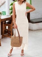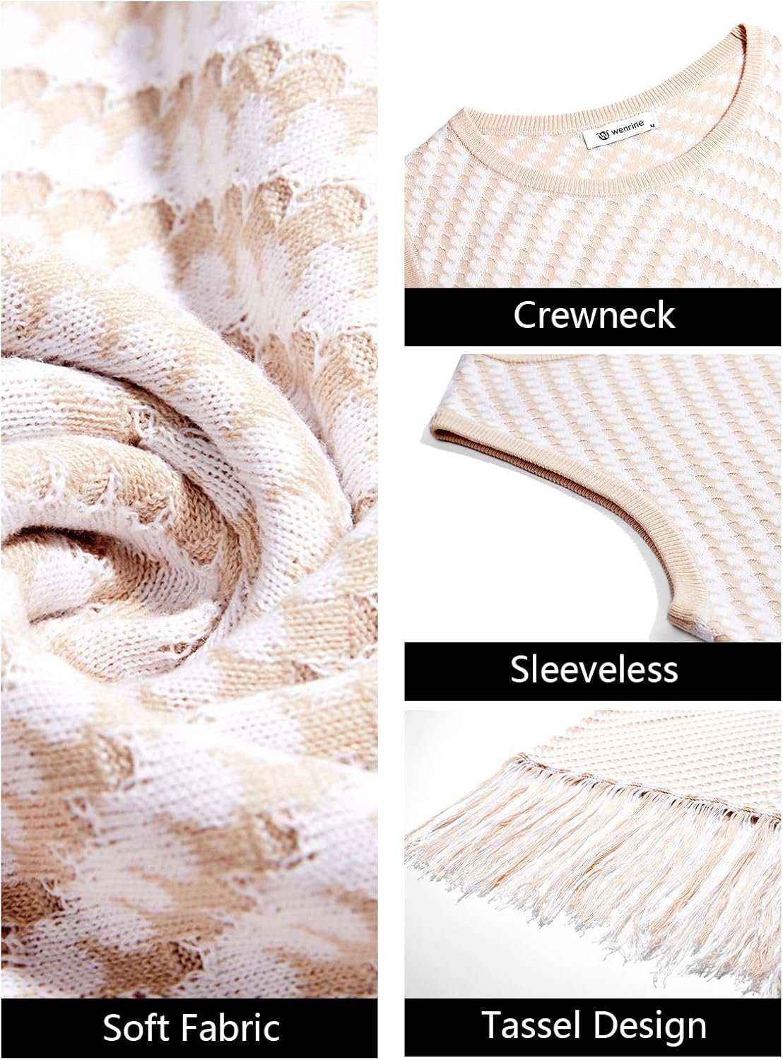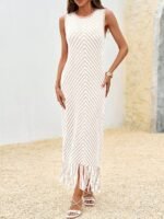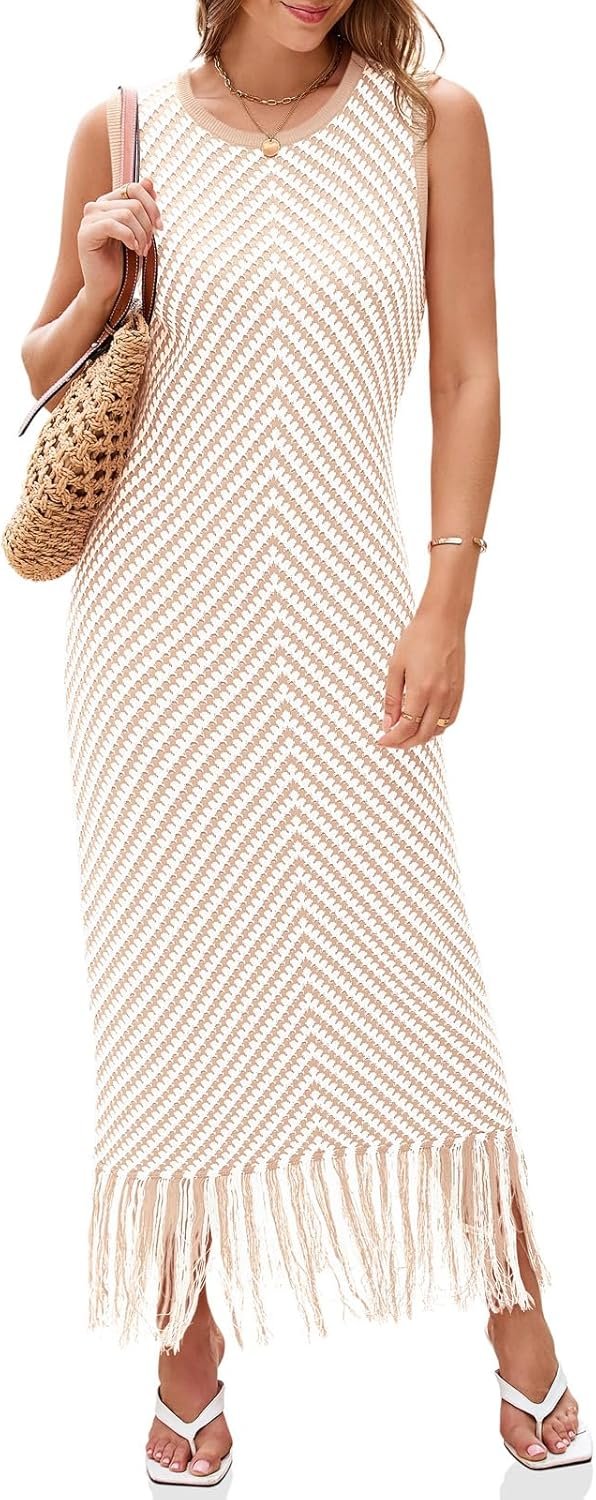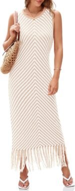 Wenrine Womens Summer Crochet Knit Dress Casual Striped Tassel Sleeveless Boho Maxi Dresses