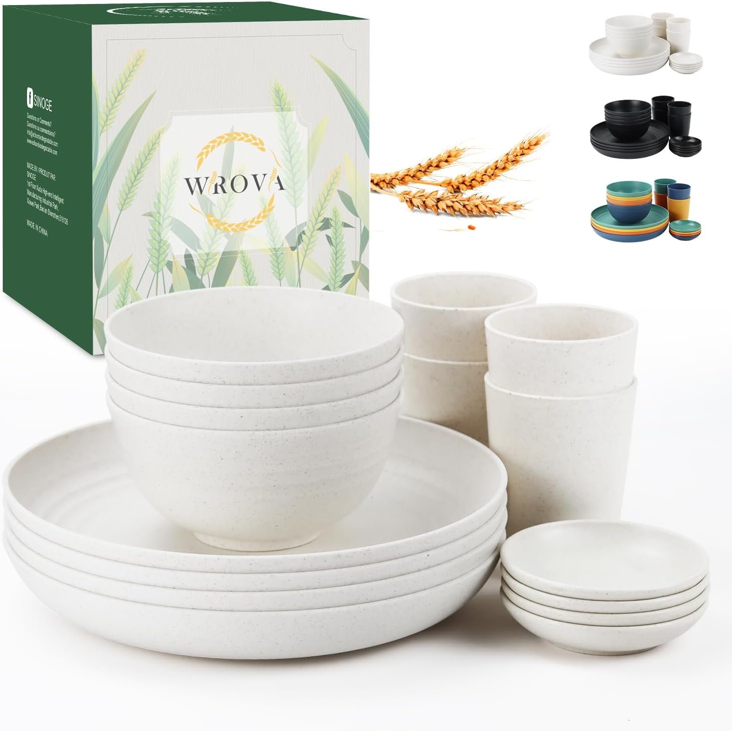✦【𝗣𝗮𝗰𝗸𝗮𝗴𝗲 𝗜𝗻𝘀𝗶𝗱𝗲】 – Wrova 16pack wheat straw dinnerware sets contains 4pcs 10inches wheat straw plates with deep edge,4pcs 26oz wheat straw bowls,4pcs 12oz wheat straw cups,4pcs sauce plates. All of them are unbreakable,bpa and lead free,lightweight and easy to clean.