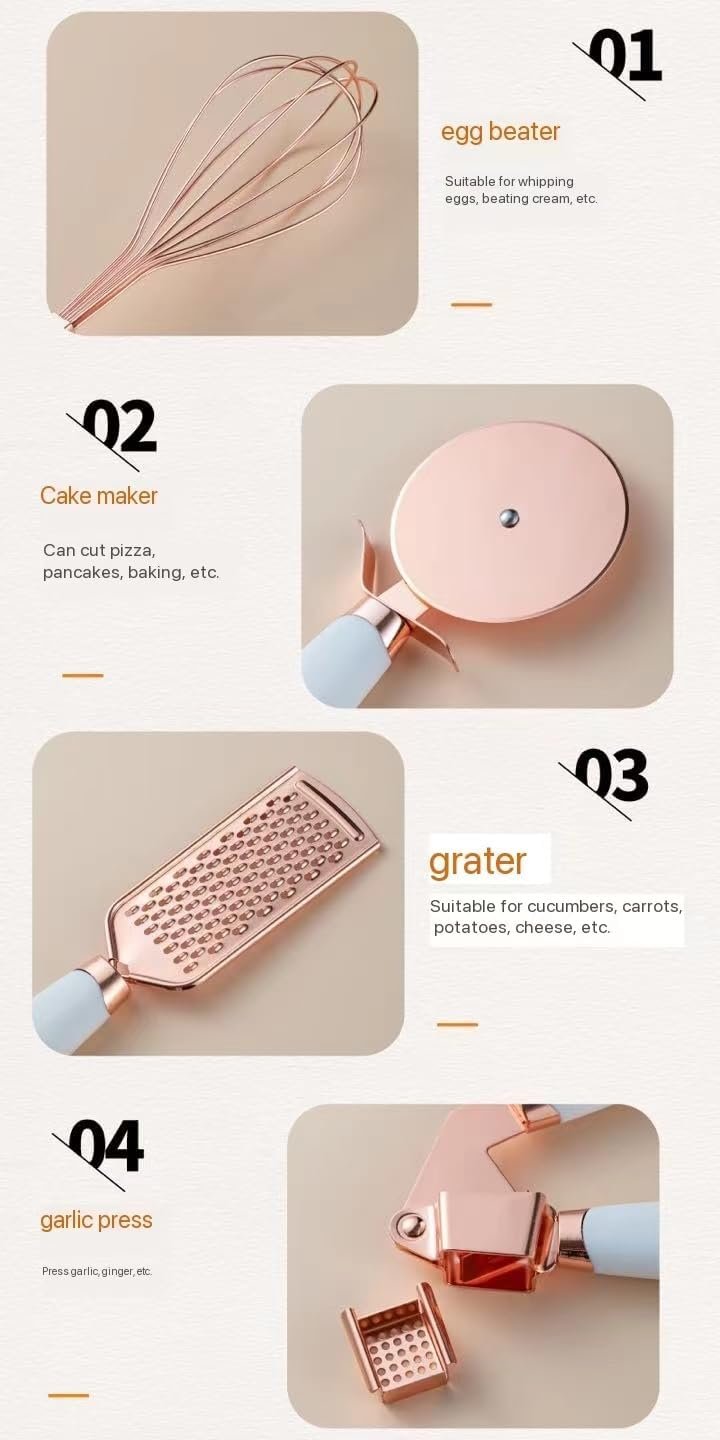 Stylish Kitchen Utensil Set: This set includes a grater, spoon, tongs, whisk, and peeler, all crafted with rose gold-colored stainless steel accents and soft pink silicone handles.