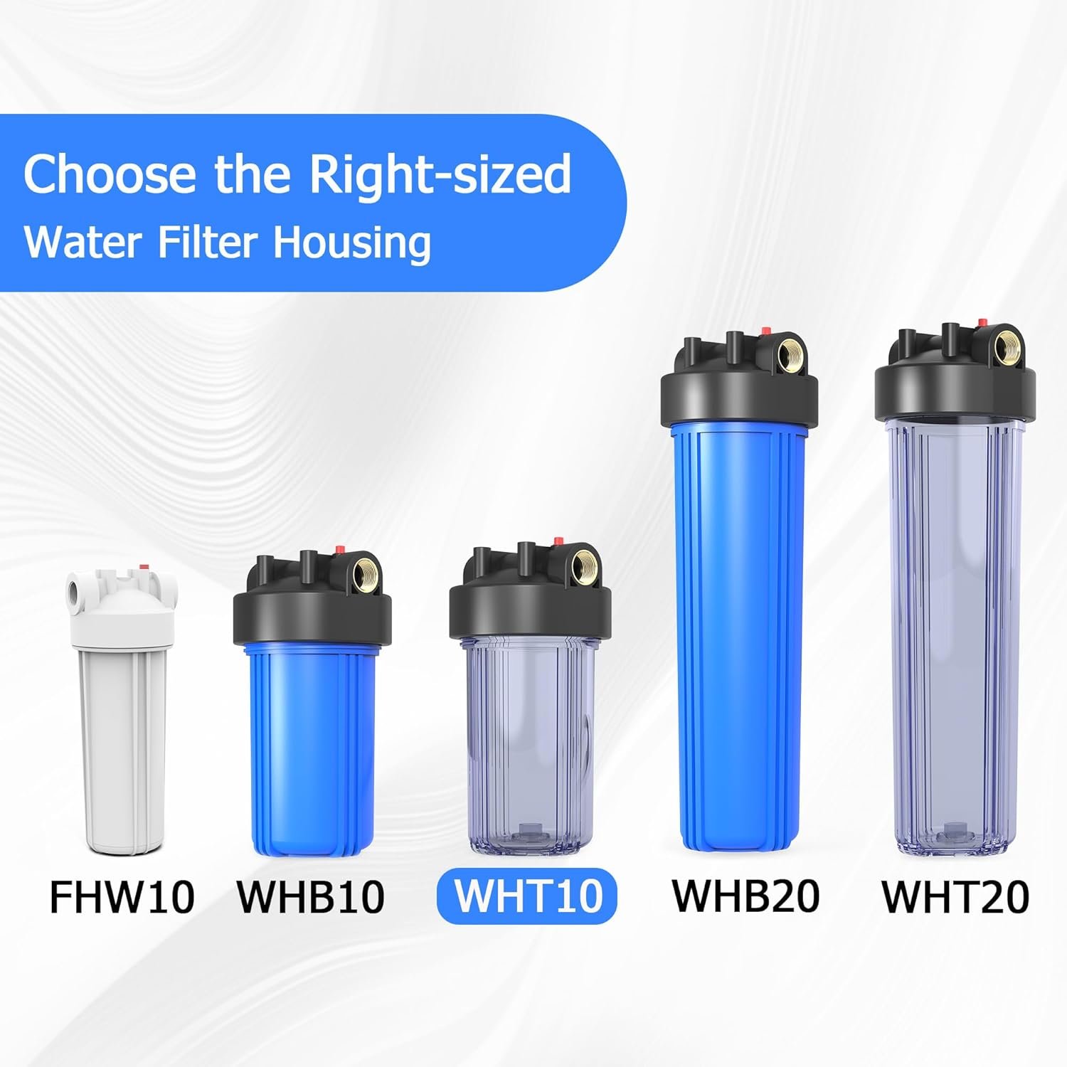 WHT10 10″x4.5″ Whole House Water Filter Housing, Fit Sediment etc Filters for Well and City Water, Big Filter Blue Pre-Filtration System for Home, 1″ NPT Port, Pressure Release (Clear Housing)