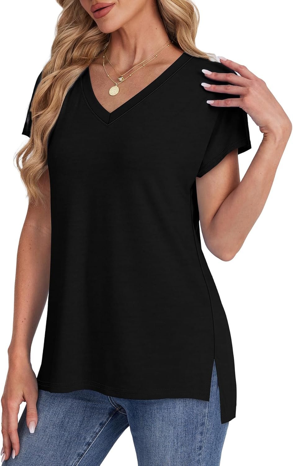 WIHOLL Womens Tops Basic Summer V Neck T Shirts Short Sleeve Dressy Casual Loose Fit Cute Tee Clothes Trendy Fashion Outfits