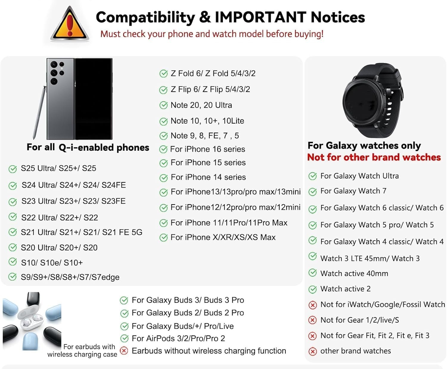 Wide Compatibility – The watch charging area is specifically designed for Samsung Galaxy Watch Ultra/7/6/6 Classic/5/5 Pro/4/4 Classic/3/Active 1/2. The phone and earbud charging areas support all wireless charging phones and earbuds, compatible with S24 Ultra/S24+/S24/S23 Ultra/S23+/S23/S22/S21/S10/Note 20/Z Flip6/Z Fold6 and iPhone 16 series, as well as Galaxy Buds series. (Note: Not for Apple Watch)