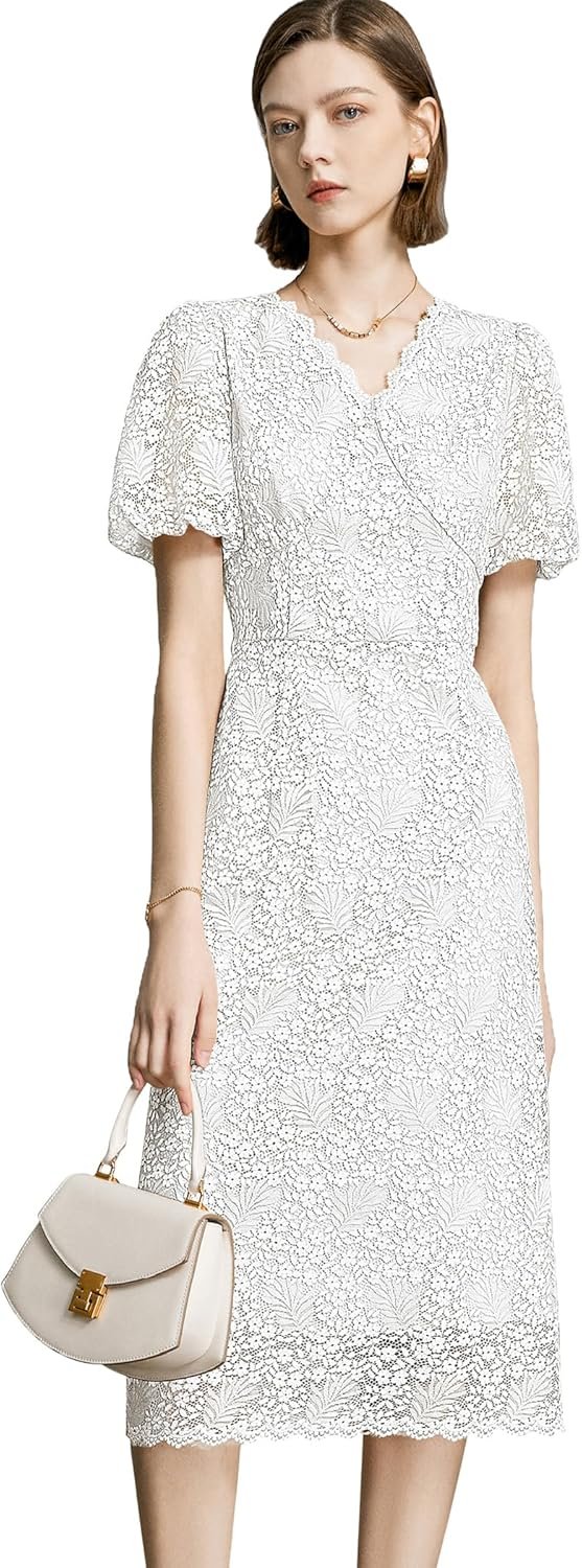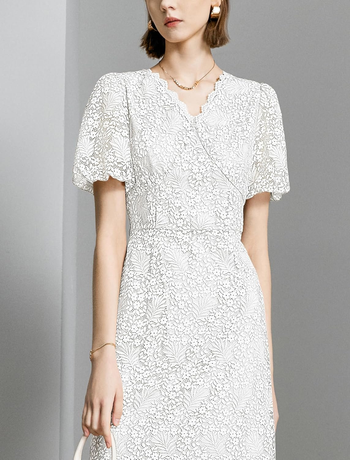 Women’s Lace Floral V-Neck Dress with Puff Sleeves and Back Zipper, Elegant and Romantic Design, White