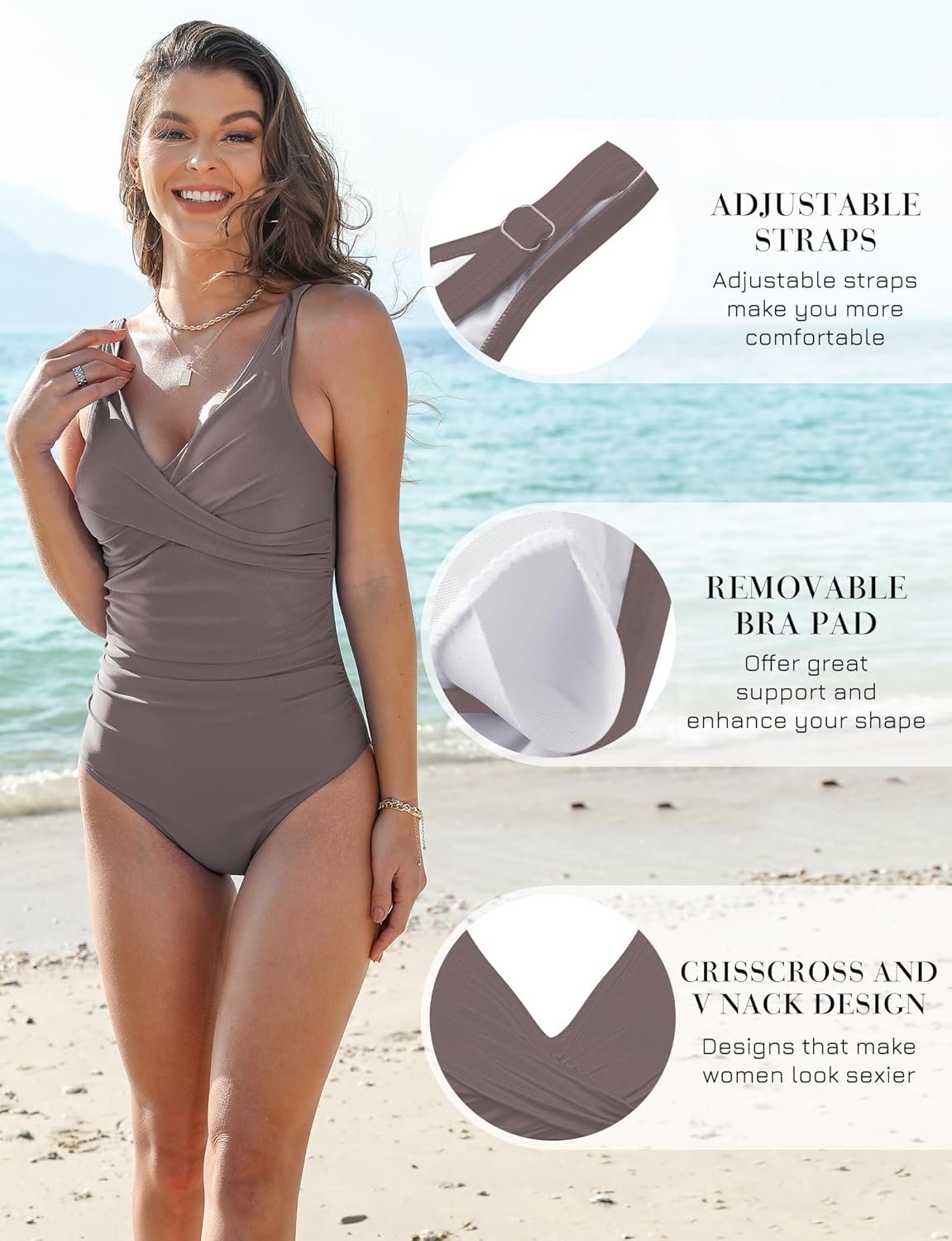 Women’s One Piece Swimsuits Tummy Control Bathing Suits for Womens V Neck Criss Cross Ruched Push Up Slimming Swimwear