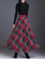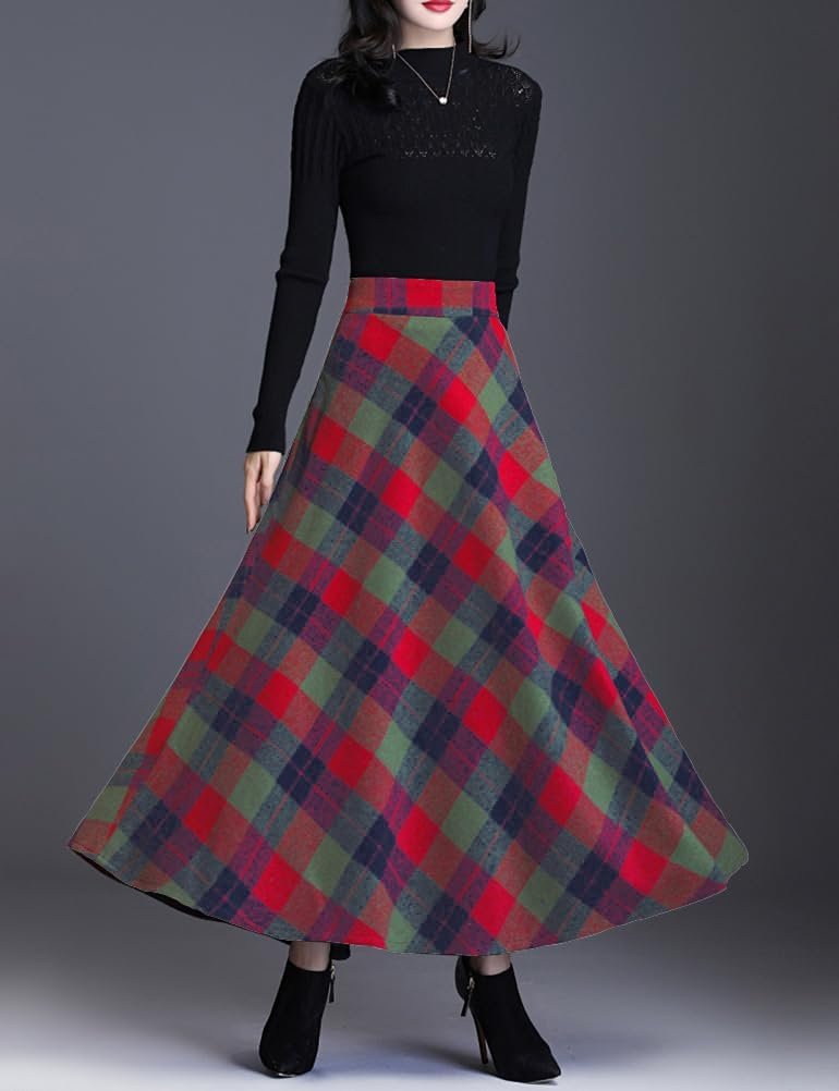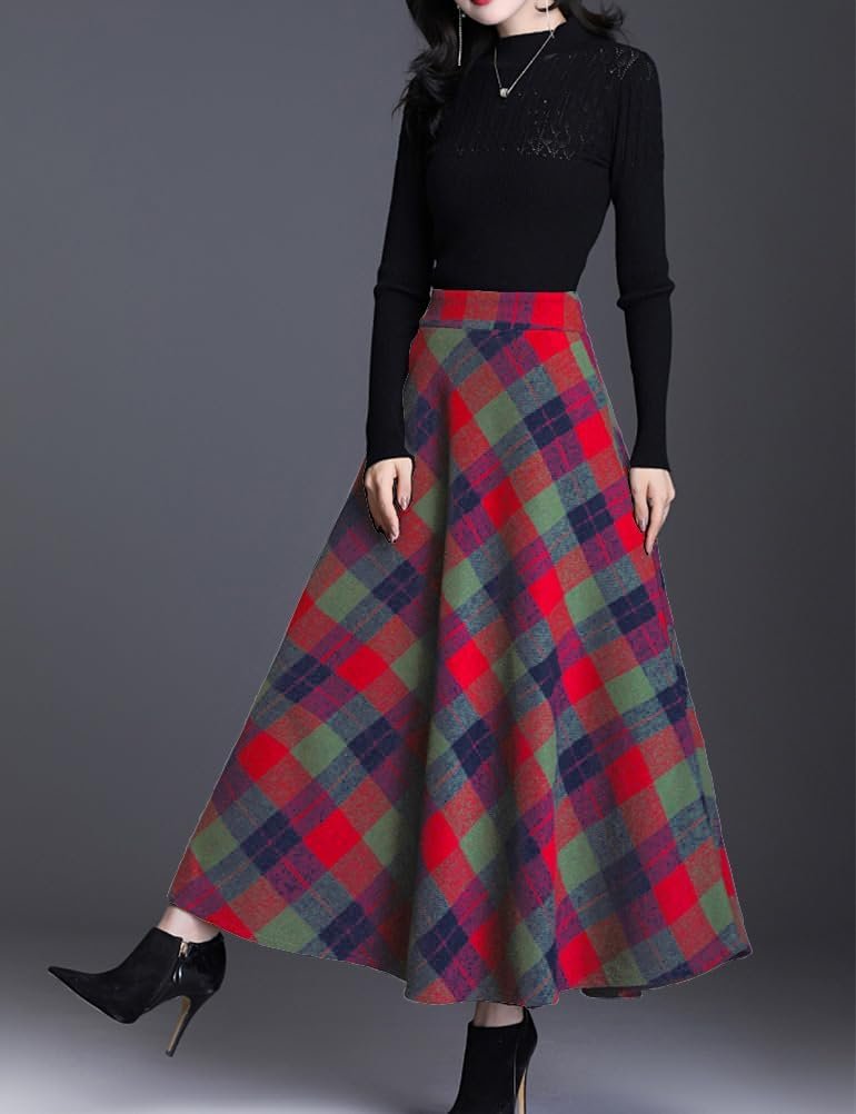 Womens Plaid Wool Skirts Warm Elastic High Waist A-Line Tartan Long Skirt
