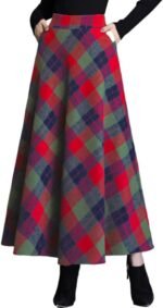 Women’s Plaid Skirt Warm Elastic Waist Wool A-Line Pleated Tartan Winter Long Skirts