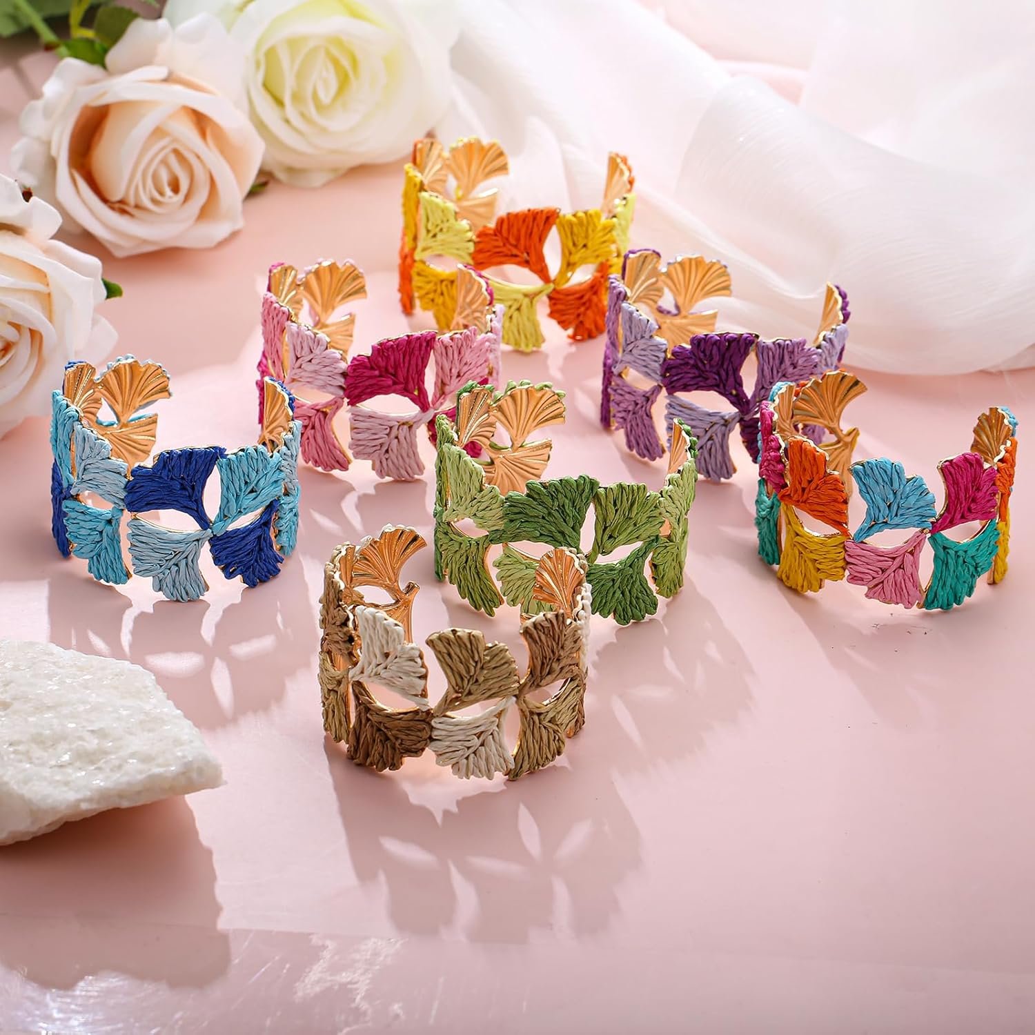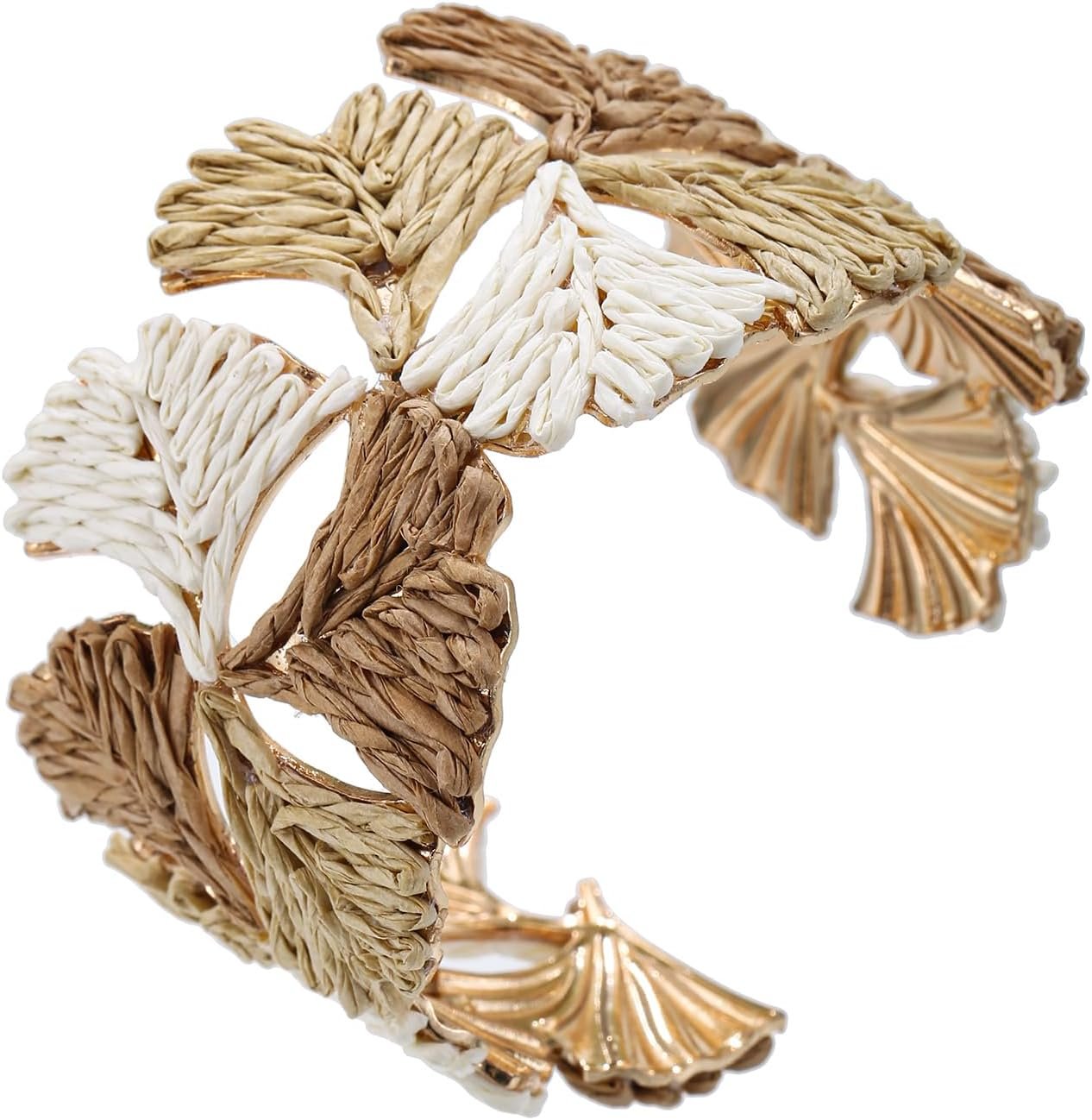 Women’s Raffia Cuff Bracelet with Ginkgo Leaf, Handmade Summer Beach Jewelry, Vibrant Gradient Colors, Adjustable Open Cuff Design