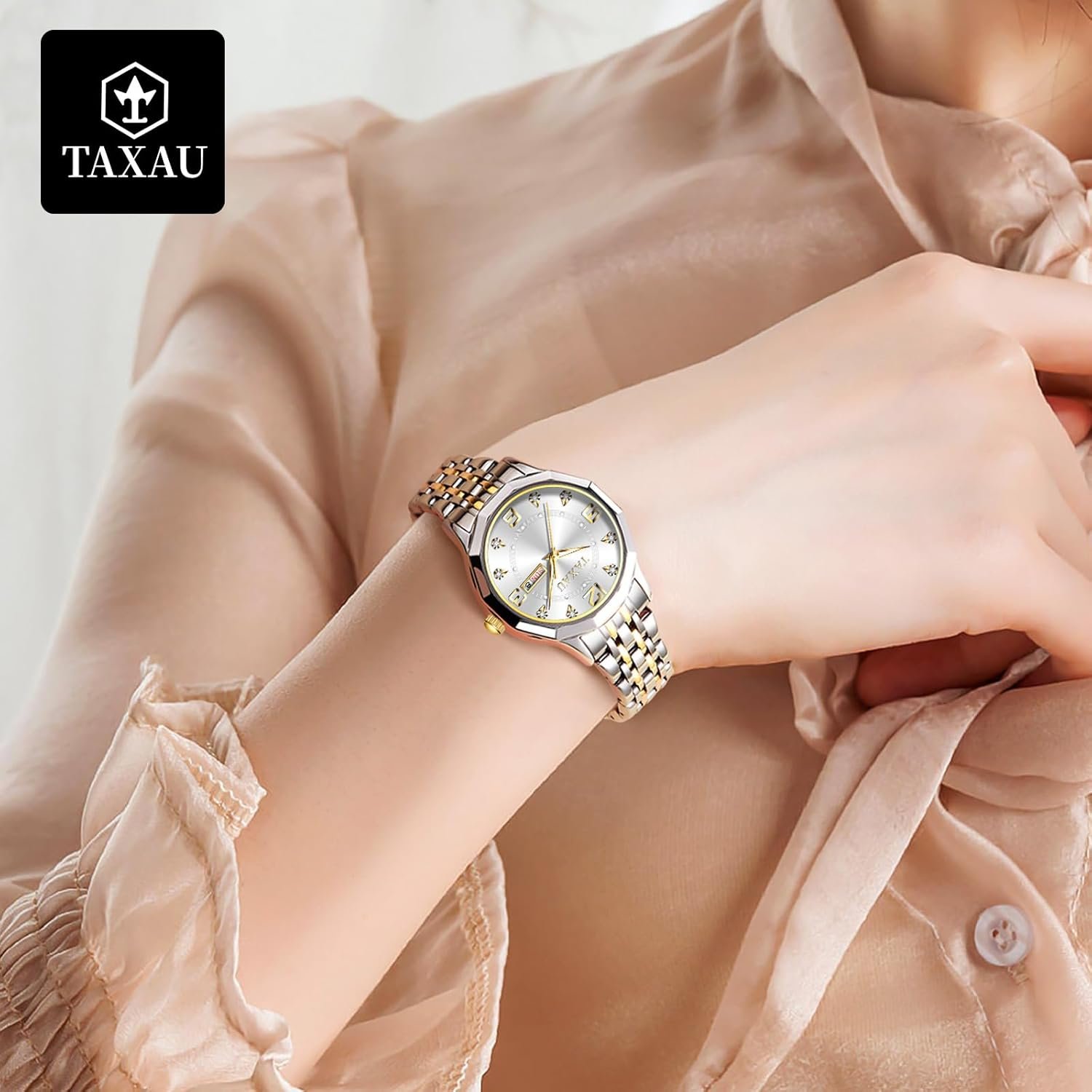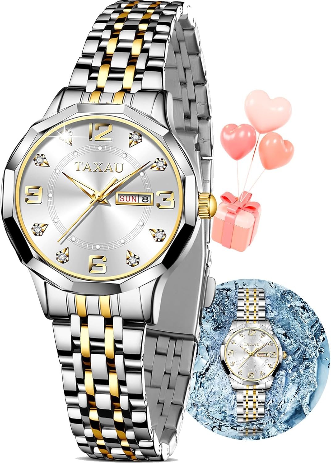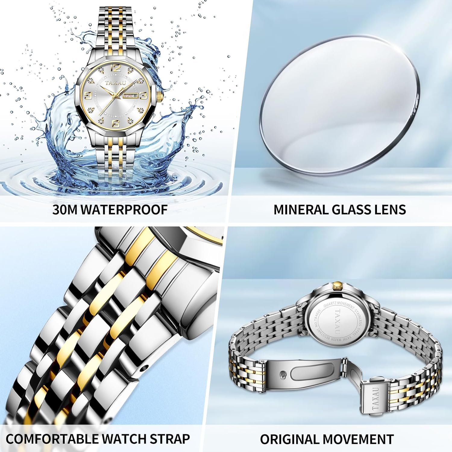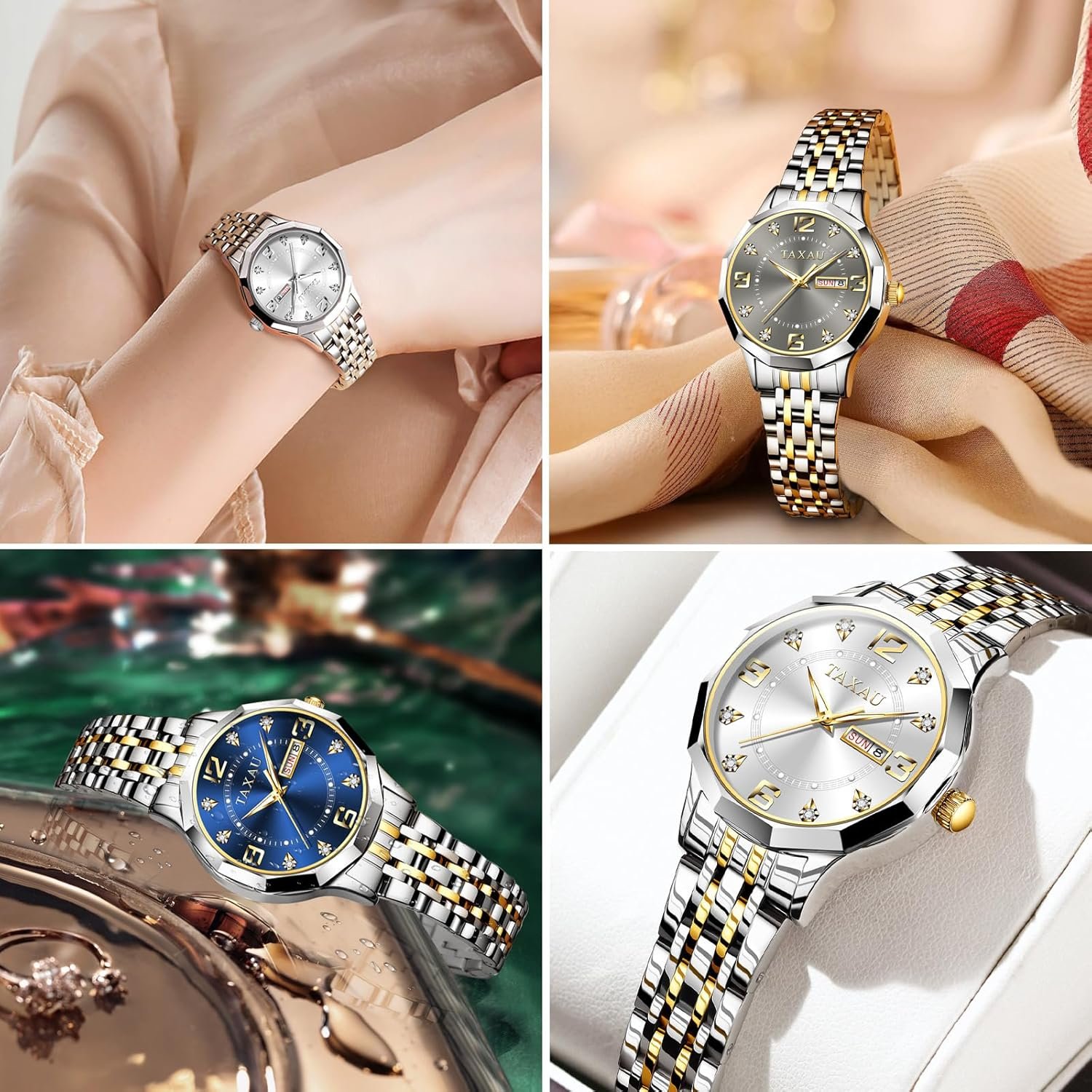 Women’s Stainless Steel Waterproof Analog Watches for Small Wrists, Luxury Dress Diamond Watches with Day Date