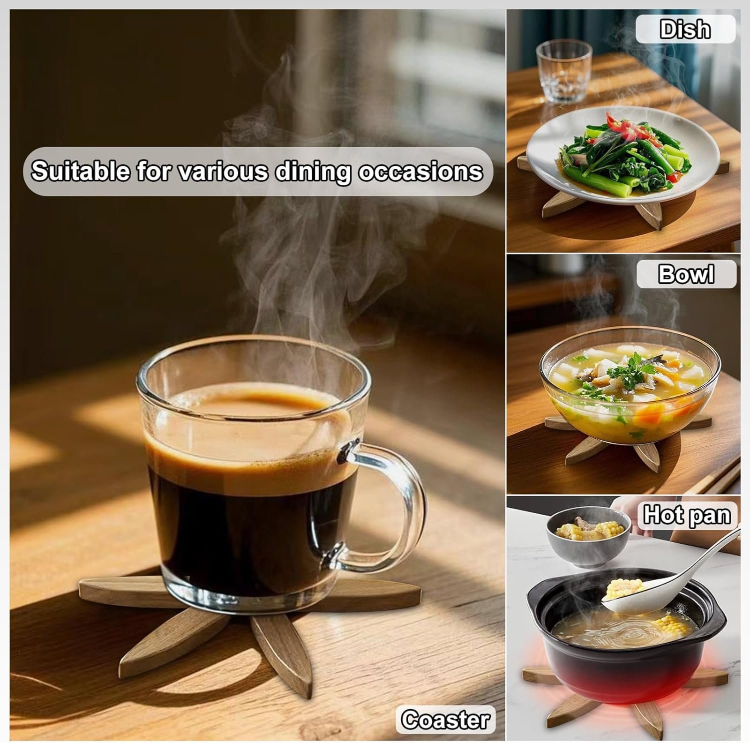 【Multi-functional use】 This wooden trivets for hot dishes is suitable for hot pots, bowls and plates, and can also be used as a coaster, suitable for various dining occasions