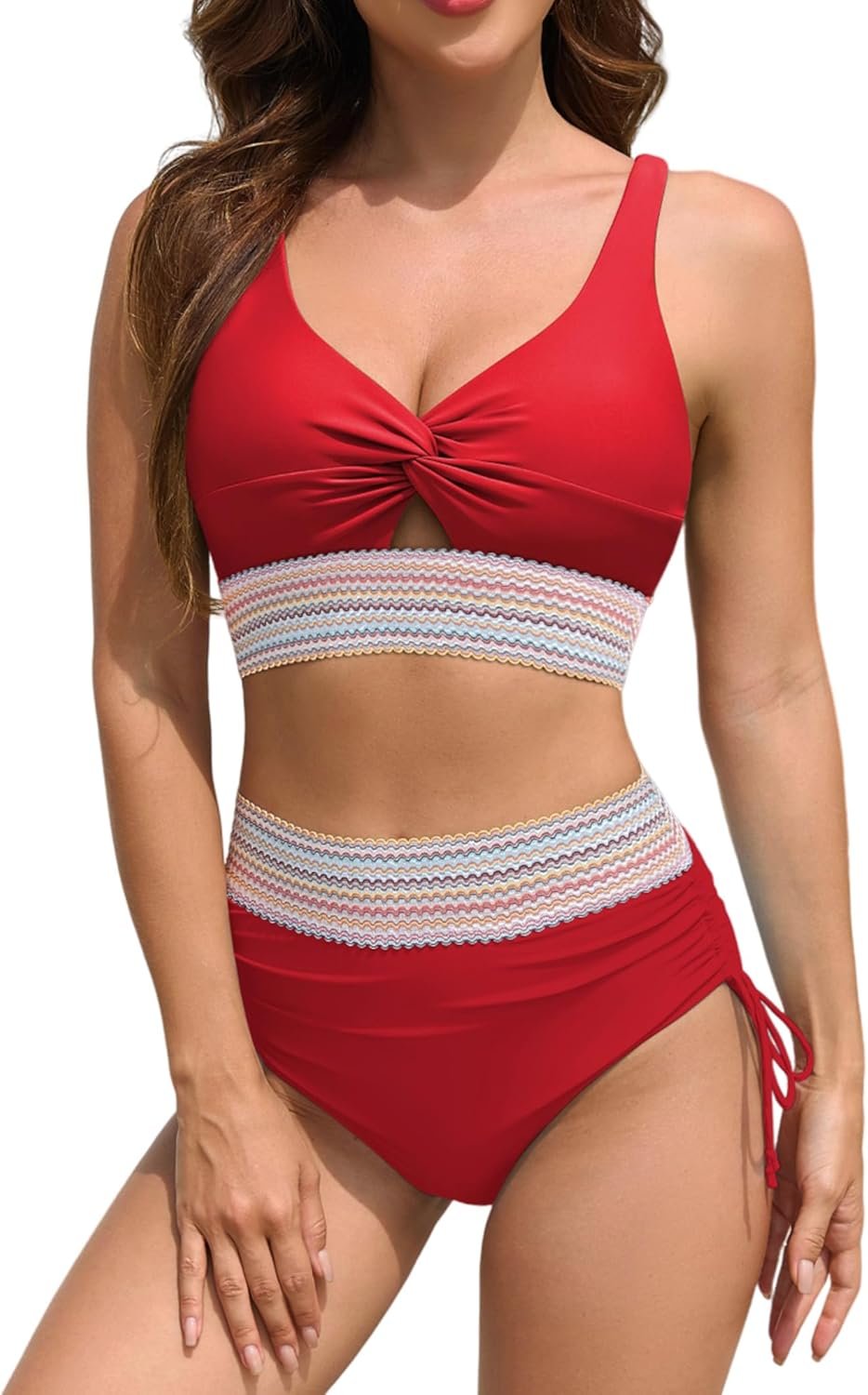 ZAFUL Women High Waisted Bikini Sets Color Block Swimsuit Two Piece Knot Twist Cut Out Drawstring Bathing Suit