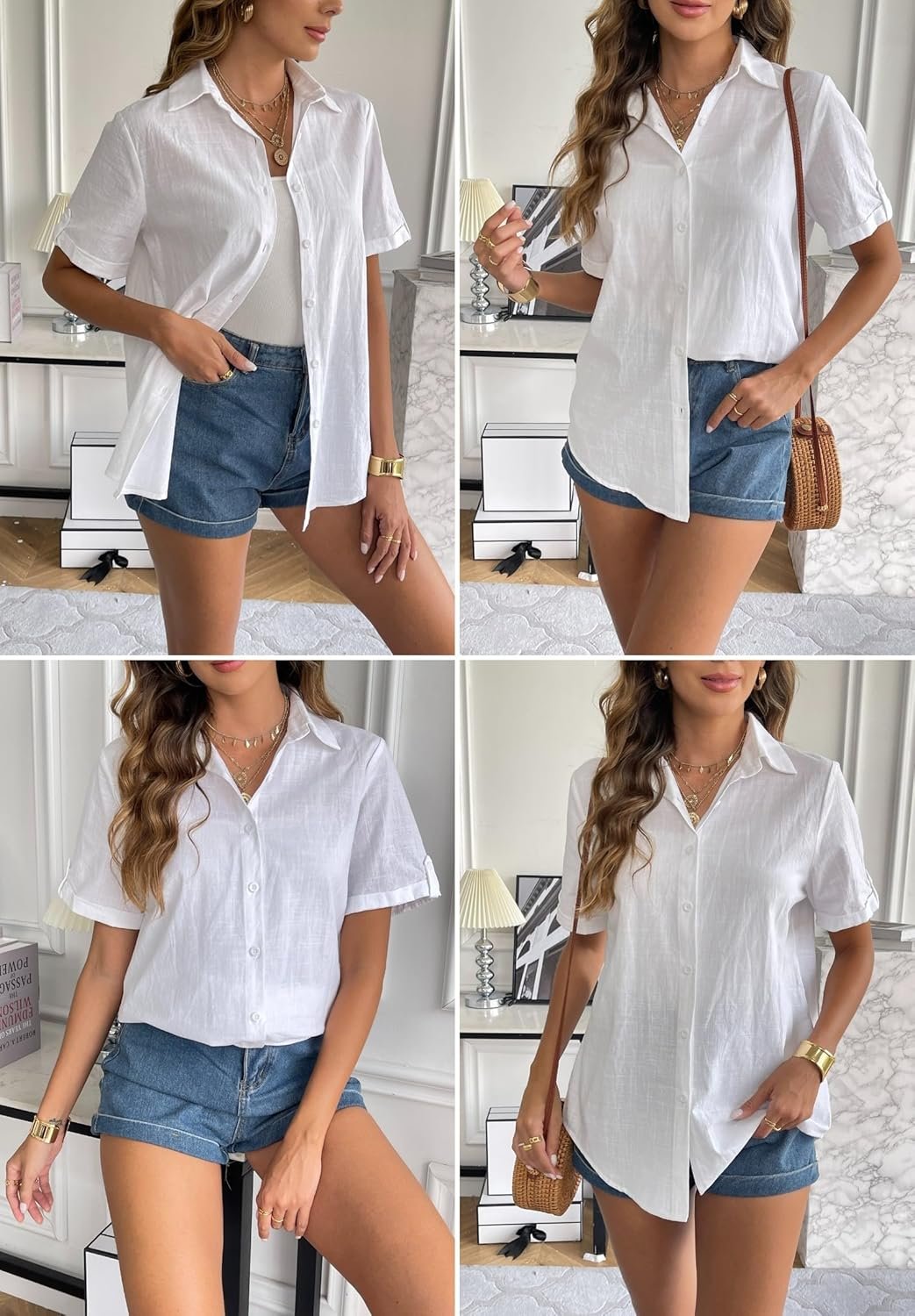 Zeagoo Women Linen Button Down Shirt Rolled Cuffed Short Sleeve Blouse Ladies Summer Casual V Neck Beach Cotton Tops