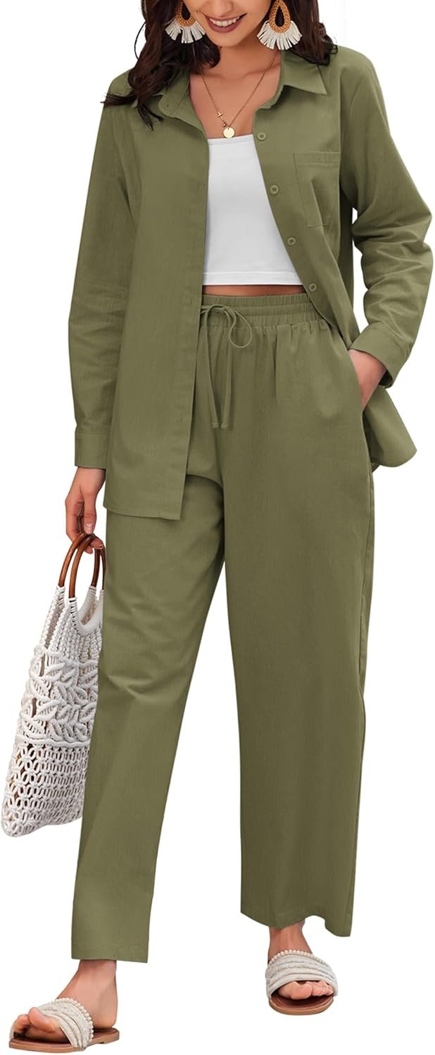 Zeagoo Women Linen Suit Two Piece Outfits Summer Beach Linen Shirt and Pants Set