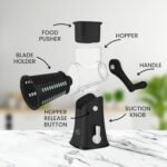 GRATE, SLICE, AND SHRED: With 5 interchangeable stainless steel blades, this rotary grater is perfect for thin and wavy vegetable slicing, coarse shredding, and fine and coarse julienne. The sharp blades of this multifunctional grater are perfect for grating with carrots, cucumbers, potatoes, nuts, cookies, and even a soft block of cheese.