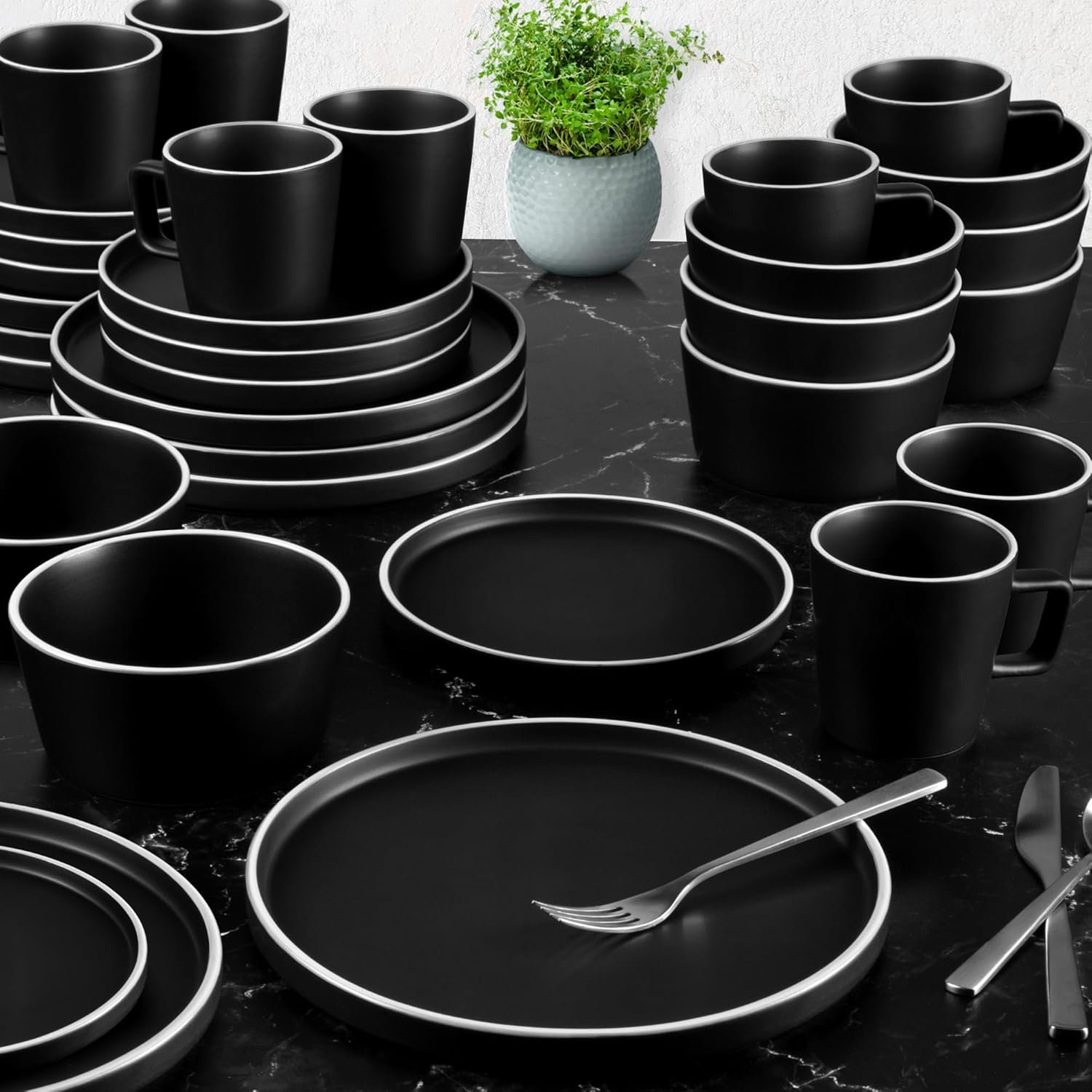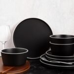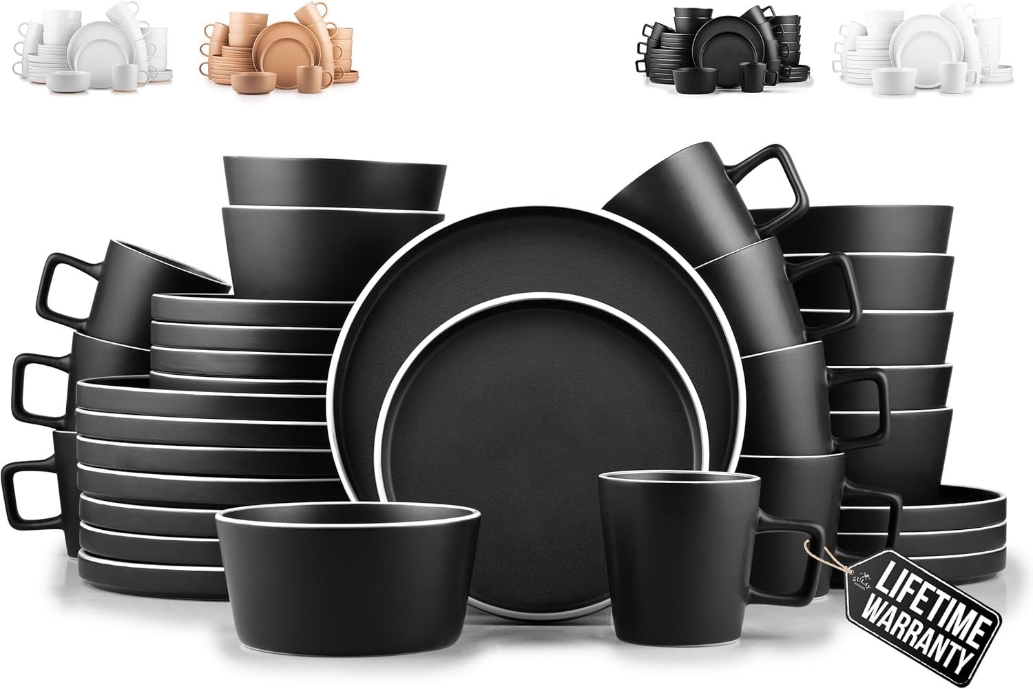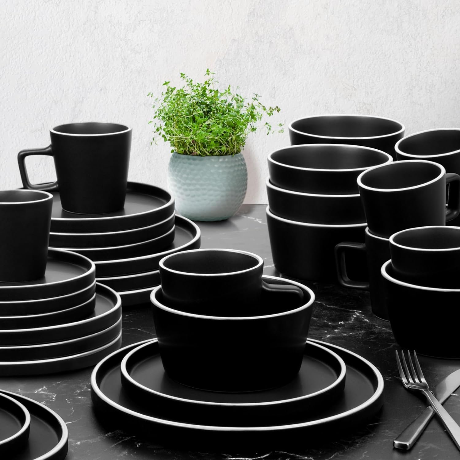Be the first to review “Zulay Kitchen Terra Stoneware 32-Piece Dinnerware Set, Artisanal Ceramic Plates and Bowls Set Crafted at 2300℉ – Service for 8, Black Matte with White Rim”